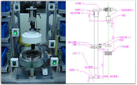 “剎車片分揀視覺系統”,本系統采用先進的圖像視覺檢測技術,實現對運動中的剎車片進行實時分揀。系統配備一臺高速工業相機,高速工業相機在不同的工位采集到剎車片圖像,并將圖像數據傳送到圖像處理系統,圖像處理系統對每幅圖像進行預處理、匹配定位、特征區域自動搜尋、相關尺寸測量等運算,并與標準模板圖像或設定的相關參數進行比較,如果發現不一致的區域并且超過設定的參數范圍,則輸出報警信號。
